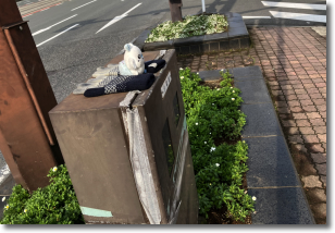 2026/02/16 12:01:57、歩道のわきの分電盤の上に並べて置かれたマスコット人形と手袋。天気が崩れる前に持ち主が気付きますように。